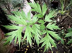 The roots become narrower further down and are not fused together. There are no creeping stems (or stolons). The grey to light brown stems grow in clumps from a gnarled root crown, seldom branch, remain approximately the same width during the growing season, and after some years may reach 4 cm in diameter. Young stems are light green, with at their base eight to twelve scales. Leaves are light green above and glaucous pale green below. In the lowest leaves, the leaf stalk is 9–15 cm long, while the leaf blade is twice compounded or deeply divided (or biternate), with the primary leaflets on a short stem of 2–3 cm, the leaflet blades 6-12 × 5–13 cm, those usually incised almost to the base, having three segments, at base extending along the stalk until disappearing (or decurrent). Each of the segments 4-9 × 1.5-4 cm, mostly incised to midlength into three lobes of 2-5 × .5-1.5 cm, with an entire margin or one or two teeth, pointy at their tips.[4][5]