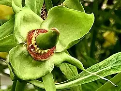 The carpels develop into cylindrical fruits (or follicles) of 4.7-7 × 2-3.3 cm. These dehisce in August to reveal large, dark brown, globose seeds measuring 1.3 cm in diameter.[4][5]