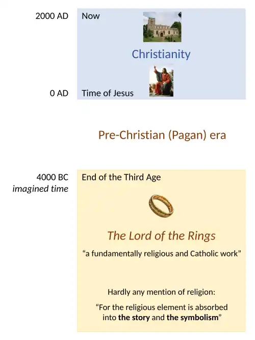 The Lord of the Rings is of course a fundamentally religious and Catholic work; unconsciously so at first, but consciously in the revision. That is why I have not put in, or have cut out, practically all references to anything like 'religion', to cults or practices, in the imaginary world. For the religious element is absorbed into the story and the symbolism.[T 1]