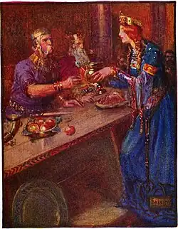 Middle-earth is strongly influenced by the Old English poem Beowulf. Tolkien made extensive use of the poem in his Middle-earth writings, not least for his boldly Anglo-Saxon Riders of Rohan. One aspect of paganism, the Northern courage so prominent in Beowulf,[T 7] appears as a central virtue in The Lord of the Rings. The Tolkien scholar Tom Shippey takes the wildly blowing battle-horns of the Riders of Rohan, storming into battle, to mean "bravado and recklessness", that "he who fears for his life shall lose it, but that dying undaunted is no defeat; furthermore that this was true before the Christian myth that came to explain why".[28] The medievalist Elizabeth Solopova contrasts the hero and future king Aragorn with the old Steward of Gondor, Denethor, who is incapable of such Northern courage.[29] Shippey observes that Denethor's other opposite, King Théoden of Rohan, lives by Northern courage, and dies through Denethor's despair.[30] Tolkien stated in his 1936 lecture The Monsters and the Critics that he was inspired by the apocalyptic Norse legend of Ragnarök, where the gods know that they are doomed in their final battle for the world, but go to fight anyway. Even the home-loving Hobbits Frodo and Sam share this courage, knowing they have little prospect of returning home from their desperate mission to Mount Doom.[29]