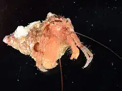 Pagurus dalli, commonly known as the whiteknee hermit or whiteknee hermit crab, is a species of hermit crab in the family Paguridae.[1][3] It is found in the northeastern Pacific Ocean at depths down to about 276 m (900 ft). It usually lives in a mutualistic symbiosis with a sponge, or sometimes a hydroid.