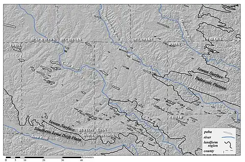 Paha (or greda) are elongated landforms composed either of only loess or till capped by loess.[1] In Iowa, paha are prominent hills that are oriented from northwest to southeast, formed during the period of mass erosion that developed the Iowan surface, and they are considered erosional remnants since they often preserve buried soils. Paha generally rise above the surrounding landscape more than 6.1 metres (20 ft).[2] The word paha means hill in Dakota Sioux.[3] Well known pahas include the hill on which the town of Mount Vernon, Iowa developed, Casey's Paha in Tama County, Iowa, and the Kirkwood Paha, home of Kirkwood Community College's campus.[3] These features are found in other regions of the United States and in Europe, where they are known as greda.