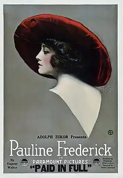 Paid in Full is a lost[1][2] 1919 American silent drama film starring Pauline Frederick and directed by Emile Chautard. It was produced by Famous Players–Lasky and released by Paramount Pictures.[3] The film is based on the hit 1908 Broadway stage play Paid in Full by Eugene Walter which starred Lillian Albertson.[4] Two previous silent films appeared in 1910 as a short and in 1914 as a feature.