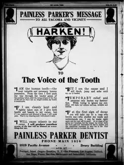 Painless Parker (born Edgar R.R. Parker;[1][2] March 22, 1872 โ November 8, 1952) was a Canadian-born street dentist[1] described as "a menace to the dignity of the profession" by the American Dental Association.[3] However, some of the causes he championed, such as accessible dental care and advertising, have since been accepted.[4]