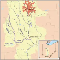 Paint Creek is a tributary of the Scioto River, 94.7 miles (152.4 km) long,[4] in south-central Ohio in the United States.[5] Via the Scioto and Ohio Rivers, it is part of the watershed of the Mississippi River. It drains an area of 1,143 square miles (2,960 km2).[4]