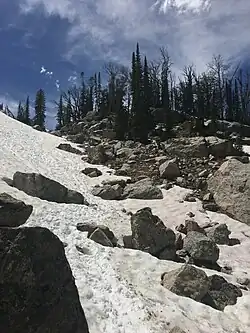 Paintbrush Divide is a pedestrian mountain pass located in the Teton Range, Grand Teton National Park, in the U.S. state of Wyoming.[3] Situated at approximately 10,720 ft (3,270 m) above sea level, the pass can be accessed from the east by way of the Paintbrush Canyon or Cascade Canyon Trails and involves a nearly 4,000 ft (1,200 m) elevation gain.[4]