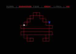 Painter is an action-puzzle game in which the player controls a white sprite character.[1][2][3] The objective of the game is to paint all the lines in a grid to fill the enclosed blocks by guiding the character around them.[4][5][6] Enemies roam the area chasing the player and must be avoided by making holes in the grid, temporarily preventing both the enemies and the player from passing over them.[1][5][6] The player also faces a time limit for completing each grid.[2][6][7] Once all the lines are painted and the grid areas are filled with color, the player advances to the next level.[1][4][7] The game has over 100 levels, each containing a set of intersecting blocks.[2][8] Levels become increasingly complex as the player progresses, introducing invisible grid lines, shorter time limits, and intricate layouts.[1][2][7] Progress can be resumed using passwords given after completing each level.[2][5][7]