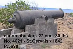 In 1827, the French navy ordered fifty large guns on the Paixhans model from the Ruelle Foundry and at Indret near Nantes. The gun chosen, the canon-obusier de 80, was so called because it was of the 22 cm (8.7 in) bore diameter which would have fired an 80-pound solid shot. The gun barrel weighed 3,600 kg (7,900 lb) and the bore was of 23 cm (9.1 in) diameter and 2.8 m (9 ft 2 in) long, firing a shell weighing 23.12 kg (51.0 lb). The guns were produced slowly and were tested afloat through the 1830s.[6][7]
