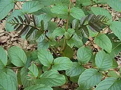 Its leaves are compound, ovate and chartaceous, they are imparipinnate and glabrous with 7-17 leaflets. They may be up to 120 cm (47 in) long, with the apex being acuminate. The rachis is triangular and glabrous. The petiolule is 0.6 cm (0.24 in) long and the midrib is flat or slightly canaliculate. The tertiary nerves are broadly reticulate.[6]