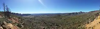 Pakhuis Pass is a mountain pass on the R364 in the northern Cederberg in South Africa. The pass connects Clanwilliam to Calvinia. A turnoff from the pass heads southeast to the Biedouw Valley and Wupperthal. The pass is 25 km long, reaches an altitude of 905 m at a gradient of 1:9.