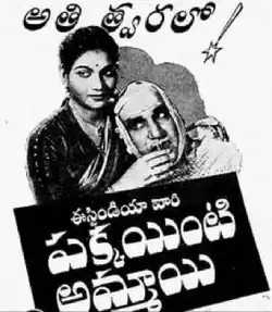 Pakka Inti Ammayi (transl. 'The girl next door')[1] is a 1953 Indian Telugu-language romantic comedy film directed by C. Pullayya.[2] The film featured Anjali Devi as the beautiful titular girl next door. Famous comedian Relangi acted as her lover Subbarayudu and veteran South Indian singer A. M. Rajah as his friend. It was produced by East Indian Company.