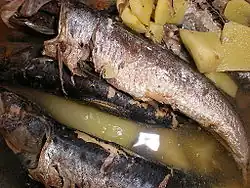 Paksiw na isda is fish poached in a vinegar broth usually seasoned with fish sauce and spiced with siling mahaba. It also usually includes vegetables, commonly eggplant and ampalaya (bitter melon).[3]