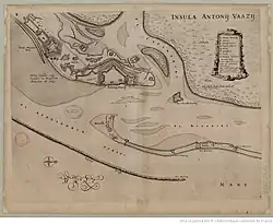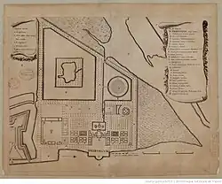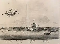 The Palace of Friburgo, the residence of John Maurice in Dutch Brazil, was built on the island of Antônio Vaz, now the Santo Antônio neighborhood of Recife, in the area that today corresponds to the República Square. The land was acquired by the count in 1639, and construction began the following year and was completed in early 1642. The palace, in front of which there was a staircase and a rectangular walled courtyard with a rounded front area, was built facing east, the sea and the old port area of Recife, while the back faced west, at the mouth of the Capibaribe River.[1][7]