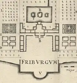 ![]() Freiburg Palace in detail in an engraving by Frans Post (c. 1643). | |