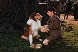 Pal's big break into the movies came in 1943 during the filming of the Metro-Goldwyn-Mayer film Lassie Come Home. The studios had decided to use a show collie trained by Frank Inn in the movie. A decision was made to take advantage of a massive flooding of the San Joaquin River in central California in order to obtain some spectacular footage for the film. Pal performed exceptionally well and the scene was completed in one take. Owner/trainer Rudd Weatherwax said director Fred M. Wilcox was so impressed with Pal during the sequence that he had "tears in his eyes." In response, producers released the female collie and hired Pal in her stead, reshooting the first six weeks of the filming with Pal now portraying Lassie.[2] Other sources say that the female collie was replaced because she began to shed excessively during shooting of the film in the summer.[3]