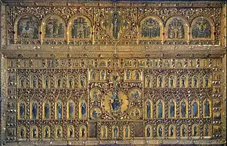 Pala d'Oro (Italian: Golden Panel) is the high altar retable of the Basilica di San Marco in Venice (and in Italian may refer to other gold altar frontals elsewhere). It is universally recognized as one of the most refined and accomplished works of Byzantine enamel, with both front and rear sides decorated. It was created and expanded in several phases over many centuries. Most of the enamel panels were made in Constantinople or Italy in a Byzantine style, but some were probably looted in Constantinople during the Fourth Crusade in 1204 and brought from there to Venice.