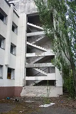 After the Chernobyl disaster in 1986, the majority of the inhabitants of Pripyat were evacuated and the buildings were abandoned. The building was temporary utilized as a makeshift courtroom in July 1987, where 6 defendants who were accused as being responsible for the Chernobyl Nuclear Disaster stood trial.[4] Currently, the Palace of Culture is in a dilapidated condition.[5]