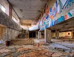Palaces of Culture were large community centers established during the Soviet era with over 137,000 in the Soviet Union by 1988. These generally physically impressive buildings were designed as a focal point for people to enjoy a range of recreational and artistic activities all under the banner, quite literally in many cases, of political propaganda. Pripyat's Palace of Culture includes what's left of a cinema, theatre, library, gymnasium, swimming pool, boxing/wrestling ring, dancing and meeting halls and even has a shooting range in the basement.[3]