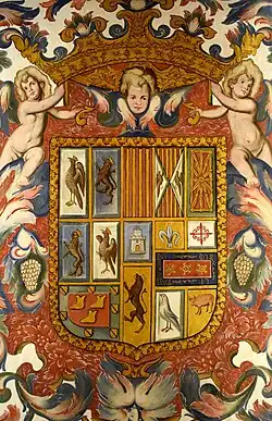 The palace preserves three coat of arms carved in stone, located outside: the oldest one dates from the 16th century, embedded under the balcony of the western tower representing the Milà's coat of arms. The other one is in the finished part in the 17th century, under a sundial, and it contains the coat of arms of Christopher II (which are Milà's, Aragon-Navarre's, Castile and León's, the Montesa order's...). The coat of arms appearing in the paintings of the throne room is very similar to the coat of arms of Christopher II, except from one thing: it also has the Mercader's coat of arms. The third blazon is located in the ancient parade ground, and includes a wide range of weapons. There is another Milà's coat of arms in the side door of the church, property of Christopher II.[9]