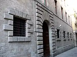 In the beginning the meetings of the Generalitat, or "Diputació del General" did not have their own building, so they took place in the monastery of Saint Francis. Subsequently, and as the Generalitat's role gained importance, they decided to obtain their own building and finally, on 3 December 1400, their representatives, Alfons de Tous, Jaume Marc and Ramón Desplà, acquired Pere Brunet's house on the Carrer de Sant Honorat for 38,500 sous. This consisted of a small space with a façade on the Carrer de Sant Francesc, a central courtyard, another space closer to Carrer del Bisbe and a small orchard. This building gave onto Carrer Sant Honorat.[5] On the Sant Honrat façade there was and is doorway with a semi-circular arch, over the centre of which the figure of a beadle is sculpted, and six three-lights windows divided by columns. On the first floor are two rooms that still exist, the Council Chamber for the meetings of the deputies and the Chamber of the Judges.[6]