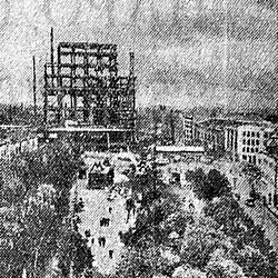 In the summer of 1940, when the lower load-bearing columns were partially installed, the time to complete the whole frame was estimated at 30 months.[176] A newspaper photograph dated 26 June 1941 attests that by then the frame of the northern wing was largely complete. According to Iofan's biographer Maria Kostyuk, the palace would have certainly been built had it not been for the German invasion.[177]