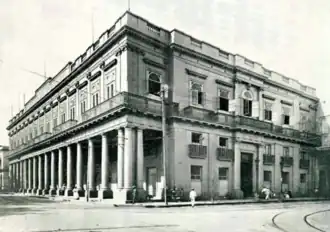The Palacio de Aldama was built in 1840, and had two floors and a mezzanine; it is estimated that its cost was around one million pesos, a great sum for the time notes Dr. Juan de las Cuevas.[4] The Aldama Palace is actually two adjoining houses, "treated as an architectural unit of exceptional monumentality."[2] The larger house, that of Domingo Aldama and Arréchaga, located on the north side of the site, the other, that of his daughter Rosa who was married to the writer Domingo del Monte.[5][b]Domingo del Monte was born in Maracaibo, Venezuela from a wealthy family, his parents were Leonardo del Monte y Medrano, an assistant and Lieutenant for the Governor in that city native of Santo Domingo, and Rosa Aponte y Sánchez, the daughter and heir of a known and influential planter.[7][8] Del Monte attended preschool while living in Venezuela, before his parents moved to Dominican Republic, and thereafter to Cuba in 1810. A few years later, when Del Monte was a twelve-year-old, his parents enrolled him into the Seminary of San Carlos, a catholic alma mater of Leonardo Gamboa in the novel Cecilia Valdés by Cirilo Villaverde (1812–1894).[9] He completed studies at the University of Havana and right after graduation, around the 1820s, he had a notable influence as an associate for a prominent lawyer in Havana, who shortly after, financed a trip throughout Europe and the United States for the young Del Monte.[7][9] In April 1834, Del Monte married Rosa Aldama, the daughter of a wealthy planter named Miguel de Aldama.[8] He proposed marriage to her on the Philharmonic Society salon. Rosa's father was Domingo de Aldama y Arechaga, ranked as the twelfth richest in an 1836 survey of the most wealthy Cubans.