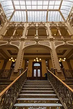 Inside, the marble floors and shelves combine with bronze and iron window frames manufactured in Florence, Italy.[3] The main stairway is characterized by two separate ramps that come together to form a landing. They also seem to cross on the second landing above, after which each move off in their own direction.[5] The meeting room contains frescos by Bartolomé Gallotti painted over a base of 24 carat gold, with themes relating to the history of written communication and the sending of messages.[3]