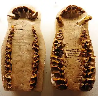 In 1804, Cuvier confirmed that the skull previously reported by de Lamanon belonged to a mammal. The skull preserves a complete set of 44 teeth that are similar to those of rhinoceroses and hyraxes. Cuvier recognized that the skull differs from other mammals and therefore established a new genus and species, Palaeotherium medium.[5][6] The genus name Palaeotherium means "ancient beast", which is a compound of the Greek prefix παλαιός ('palaios') meaning 'old' or 'ancient' and the suffix θήρ ('thēr') meaning 'beast' or 'wild animal'.[7] He debunked Lamanon's hypothesis that Palaeotherium was an omnivorous amphibian and suspected that it had trunks akin to those of tapirs.[5][2]