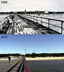 In 1882 Juozapas Tiškevičius II supervised the construction of a new Palanga Pier with a length of 380 metres.[1][2] It was primarily dedicated for exporting bricks, however, during summer time it was used for walks.[1][3] It had an attic (Italian: altana) in the beginning of the pier for protecting pedestrians from rain and was connected to a tram line.[1] Since 1892 it was dedicated for the use of pedestrians only and become a popular sea-side destination for walks.[1][3]