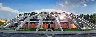 The arena is constructed with a ribbed concrete shell dome, that is 61 meters in diameter, having a total area of about 4,800 square meters,[4] and is constructed of 1,620 prefabricated concrete pieces,[3]which are braced by concrete flying buttresses. Much of the structure was prefabricated, so that the dome was erected in 40 days.[8]