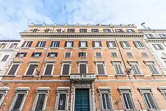 The perspective vision that is obtained creates a sort of apparently inexplicable optical effect. In fact, moving backwards from the main entrance door of the Palace, the front entrance of the Church of Santa Maria in Campitelli begins to "move" from left to right until it coincides perfectly only when you reach the threshold of the door of the Palazzetto. It is necessary to underline that at the time of planning the facade of the current Church had not yet been built and that the birthplace of Blessed Ludovica Albertoni,[7] the true spiritual authority of the family, was located on the same site. The Paluzzi Albertoni had therefore probably wanted to keep the view from door to door to keep a constant memory of the Blessed. A part of the perimeter wall of the house of the Blessed is still visible with an ancient fresco inside the Chapel of the Albertoni family in Santa Maria in Campitelli.[8]