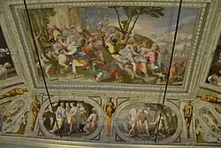 The vaulted staircase, which rises to the second floor, overlooks the inner courtyard on three sides with a loggia; the portals in white marble and those in black stone of the great hall on the first piano nobile, with Latin sentences reminiscent of Ambrogio Di Negro's humanism, are of note. The main floor hosts an important decorative cycle dating back to the late 16th century, covering the vaults of three rooms, attributed to Andrea Semino and his workshop. The main room hosts the large fresco with «The Rape of Helen», surrounded by panels with episodes from the life of Paris, while the two smaller rooms host the cycles of Danae (with Danae fecodata da Giove) and her son Perseus (with Minerva and the Muses on Helicon). According to recent studies, Andrea's sons, Cesare and Alessandro, and his brother Ottavio.[4]