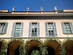 The twenty-five windows of the piano nobile are decorated with alternating triangular and curvilinear tympanums; the palace ends vertically with a cornice with corbels, surmounted by an attic at the centre of which is the family coat of arms. The interior of the palace has two courtyards, one of which is laid out as a garden; finally, worthy of note is the monumental staircase marked by barrel vault and pilasters ionic order architravate.[2]