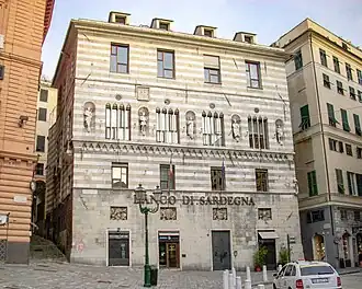 Situated on the Piazza di Luccoli, in the 13th century, a marginal but strategic location because it is close to the Porta di Santa Caterina (St. Catherine's Gate), it has a façade with two-coloured bands and niches with marble statues of illustrious family members, three of which (the first, second and fourth from the left) were executed by Domenico Gagini da Bissone.[2] In the 16th century, in addition to the replacement of the four-light windows to create new windows, the block was expanded with a revenue house on Via di San Sebastiano.