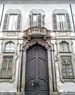 The façade on the street, dating back to the 18th century, one of the best examples of Lombard baroque in the city, has two floors decorated with fregi and stucco cornices; the stone portal is surmounted by a balcony with richly decorated balusters.[5] The inner courtyard is a square four-sided portico, with columns of Doric order in granite supporting round arches. The vaults of the portico had a typically Renaissance frescoed decoration, which partly re-emerged during restoration and alterations carried out in 1939,[2] when the architect Giovanni Muzio carried out an extension overlooking Via Vivaio.[6] On the garden front, the palace has a neoclassical façade with a rusticated ground floor, with the central body surmounted by a monumental timpanum.[7] The interior decorations are noteworthy, especially those in the Sala degli affreschi with works by Morazzone, in the Sala del consiglio with the fresco of the Apoteosi di Angelo della Vecchia nel segno delle virtù by Giambattista Tiepolo, in another room the Episodio dei Visconti by Francesco Hayez.[8] All'interno sono anche alcune sculture di Ivo Soli (1898–1976).[6]