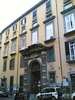The palace was first erected in the 16th century by the Pignatelli family di Monteleone (today Vibo Valentia). The design was commissioned mainly from Giovanni Vincenzo Della Monica. A major refurbishment, commissioned by Duke Nicolo Pignatelli and designed by Ferdinando Sanfelice, was completed in 1718.[1] The main portal is made of white marble and piperno rock with flanking columns with masks serving as capitals.