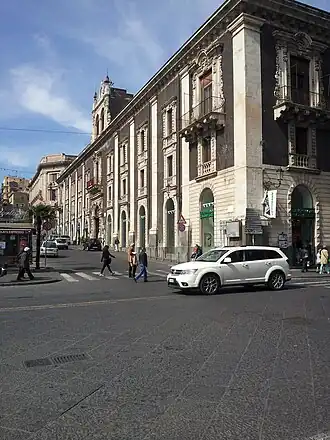The Palazzo Tezzano is a monumental palace in Piazza Stesicoro, in the center of Catania, Sicily, southern Italy. The via Etnea, with prominent shops, bisects the Piazza; this palazzo rises at the northwest intersection with this via, across from the white stone, neoclassical Palazzo Paterno del Toscano.
