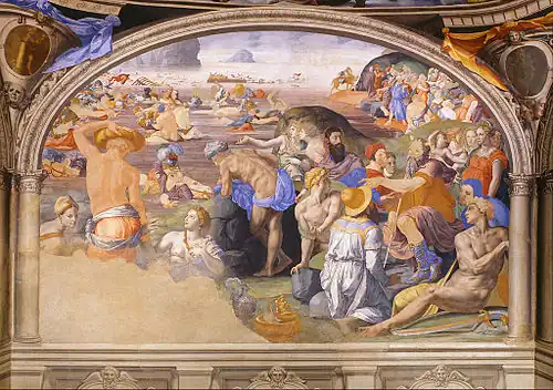 Michelangelo never proceeded beyond the preparatory drawings for the fresco he was commissioned to paint on the opposite wall. Pope Julius II called him to Rome to paint the Sistine Chapel, and the master's sketches were destroyed by eager young artists who came to study them and took away scraps.Missing Ref. The surviving decorations in this hall were made between 1555 and 1572 by Giorgio Vasari and his helpers, among them Livio Agresti from Forlì. They mark the culmination of mannerism and make this hall the showpiece of the palace.