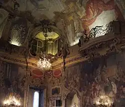 The interiors of the piano nobile are the result of two centuries of work: particularly noteworthy are the ballroom with 18th-century frescoes by Nicola Bertuzzi.[1]
