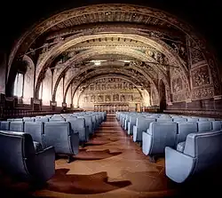 The vast room with vaults supported by eight arches is decorated with frescoes dating back to the last decade of the 13th century,[4] attributed to the Maestro del Farneto and to the Maestro Espressionista di Santa Chiara,[6] both connected to the frescoes of the Basilica of Saint Francis of Assisi. They represent Aesop's Fables, legends, biblical stories and maxims. In 1860 the frescoes were heavily restored by Perugian artist Matteo Tassi, who added neo-Gothic and eclectic decorations throughout, and repainted the emblems of successive podestà and capitani del popolo in the city's government. Two emblems of the magistrates in office between 1293 and 1297, frescoed on the counter-facade of the hall, confirm the date of the building's construction.[3] Along the perimeter is a line of seats, reconstructed in the 19th century based on the original 16th-century models. At the top, on the right wall was a passage connecting to the residence of the capitano del popolo.