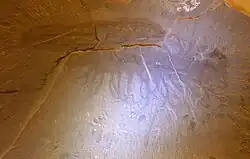 A putative red algae. It formed leaf-like lobes that measured around 25mm across. Only the sturdier parts of the skeleton are known. | ||
