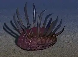 A soft bodied, disk shaped animal. Currently it is thought to have been a cambroernid, which is a group of basal ambulacrarians. |