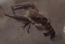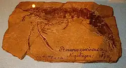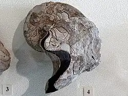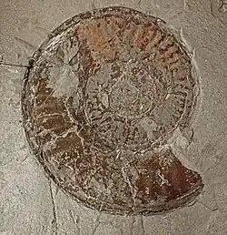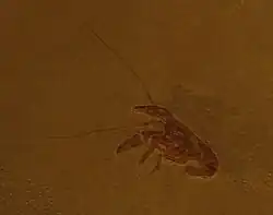 - Several empty ammonite shells from Holzmaden have been found with associated decapods inside.[6] This includes a possible member of the genus Paleastacus inside a chamber of a Harpoceras.[6] This decapod is related to the family Erymidae, which are considered to be possible bottom-dweller carnivores or carrion feeders.[6] The associated fossil has several spherical structures that had been interpreted as decapod coprolites, implying that the animal lived for a long period within the shell.[6] More recent studies had recovered new data about the inquilinism of decapods inside ammonites, this time, however, recovering three eryonoids together within a body chamber.[7] The eryonoids most likely used the ammonoid as some kind of shelter, possibly due to the shell being an ideal location to molt, protection against predators, a source of food or that the shell was used as a long-term shelter.[7] One key aspect found was that the muddy bottom was not suitable for burrowing, implying that the decapods inhabited a different shelter due to being unable to make their own.[7] Other biota are found related to the decayed ammonite shells, such as serpulid annelids and bivalves, creating what was denominated as "benthic islands".[6]