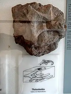 - Beyond trace fossils, several vertebrate specimens show associations with crustacean exoskeletal remains such as GPIT-PV-31586 and SMNS 58389 (Pachycormus macropterus) with necrophagous interaction as well SMNS 55934 (Stenopterygius quadriscissus) or SMNS 95401 (Metopacanthus sp.).[8]
