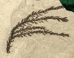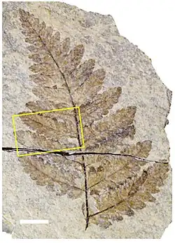Five species of ferns and fern relatives have been described from the compression biotas and an additional four compression taxa that have been tentatively identified to family or genus. A series of four additional ferns have been described from premineralized specimens in the Princeton Chert and a fifth taxon is identified to genus. Several fern specimens were briefly mentioned from Horsefly but no taxonomic assignment was made due to lack of reproductive vegetation.[20]