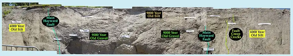 Using paleoseismology, it is now known that nearly all movement of the fault takes place with large earthquakes.[5] All seismic events with a moment magnitude of over 8 leave some trace in the sedimentation record.