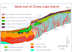 Paleoseismic investigations are commonly performed through trenching studies. A trench is dug, and geologists record the attributes of the rock layers.[2] On-fault evidence includes warping and disconformity, angular unconformity, fracturing, fissures, and colluvial wedges.[2] Off-fault evidence includes liquefaction of sand, tsunami deposits, turbidite, and marine terrace uplift.[2]