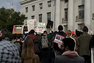 The Palestine lobby in the United States is organized by a number of pro-Palestinian advocacy groups seeking to influence the United States government, institutions, and citizens to actively oppose Israel's occupation of the Palestinian territories, many of them members or cooperating with the U.S. Campaign for Palestinian Rights.[1] These organizations include peace and anti-war, human rights, anti-Zionist, and Arab- and Muslim-American groups.[2] Groups against occupation also include Jewish Voices for Peace[1][3] and Students for Justice in Palestine,[1] among others. Their tactics include education, protest, civil disobedience and lobbying.[4][5][6][7]