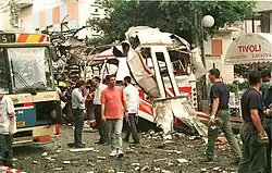 Palestinian suicide attacks involve the use of suicide bombings by Palestinian groups in the Israeli–Palestinian conflict, predominantly targeting Israeli civilians.[2] This tactic is also referred to as Palestinian suicide terrorism.[3] It emerged in the 1990s and reached its peak during the Second Intifada (2000–2005). Attacks occurred at various locations, including shopping centers, public buses, transit stations, cafes, nightclubs, and restaurants,[4] According to a 2006 study from the University of Haifa, only a few of the bombings targeted military objectives.[5] Between 1994 and 2005, suicide bombings killed 735 Israelis and wounded 4,554.[5]