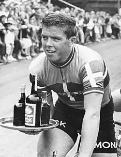 Palle Lykke Jensen (4 November 1936 – 19 April 2013) was a Danish cyclist who was active between 1956 and 1969.[1] He competed at the 1956 Summer Olympics in the road race, but failed to finish. The same year he finished fourth at the world road championships. Starting from 1958 Jensen won four consecutive national sprint titles. Between 1958 and 1968 he also won six medals at European track championships[2] and 21 six-day races out of 122 starts in Germany, Canada, Denmark, Belgium, Netherlands and UK. After marrying the daughter of Belgian cyclist Rik Van Steenbergen, in 1962 he moved to Belgium, where he worked at the Port of Antwerp.[3] With Van Steenbergen, he competed in several Six-day events.